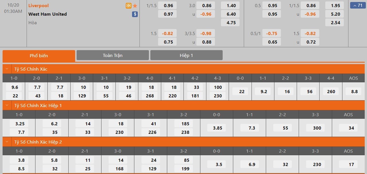 Liverpool vẫn được đánh giá cao hơn West Ham rất nhiều ở kèo đấu này. Kết quả Liverpool thắng trận chỉ có tỷ lệ là 1 ăn 1.40 trong khi đó kết quả West Ham thắng trận có tỷ lệ cược lên tới 1 ăn 6.40. Tỷ số hòa có tỷ lệ cược là 1 ăn 4.75. West Ham mùa này đang thi đấu không quá ấn tượng. Làm khách trước một Liverpool có trình độ tốt, West Ham vẫn sẽ gặp nhiều khó khăn và họ sẽ không tạo ra được nhiều bất ngờ. Cửa trên Liverpool vẫn sẽ là lựa chọn cho kèo đấu này.