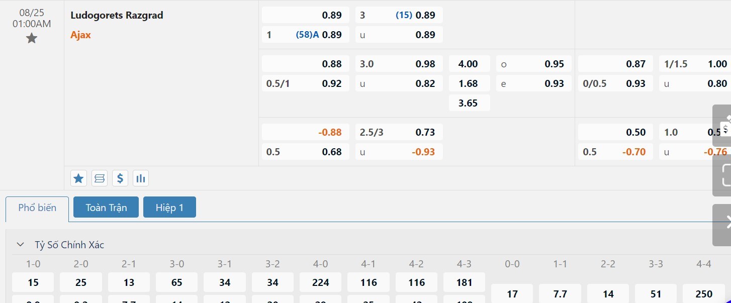 Dự đoán kèo tỷ số hiệp 1: Ludogorets 0-1 Ajax