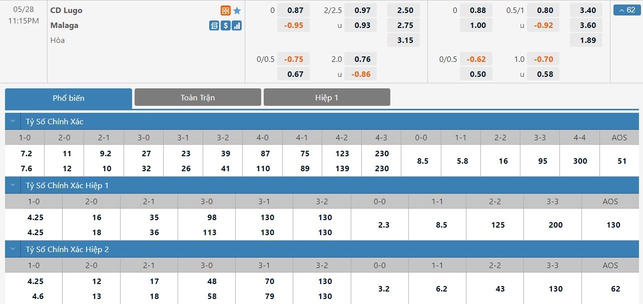 Dự đoán kèo tỷ số hiệp 1: Lugo 0-0 Malaga