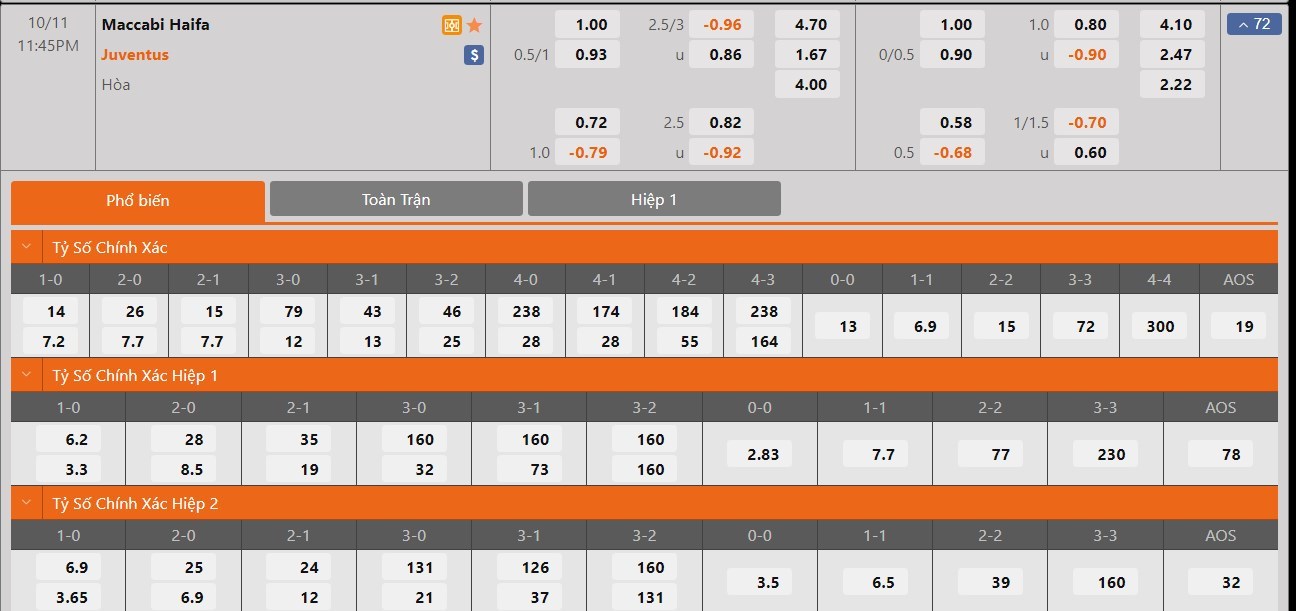 Soi kèo tài xỉu, kèo tỷ số Maccabi Haifa vs Juventus