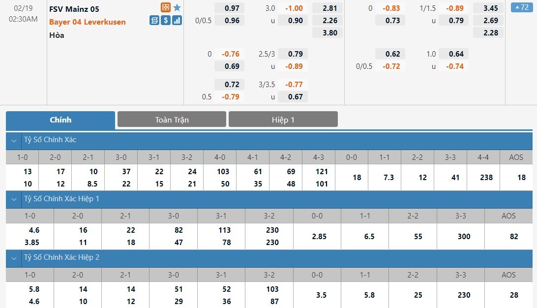 Dự đoán kèo tỷ số hiệp 1: Mainz 05 0-2 Bayer Leverkusen