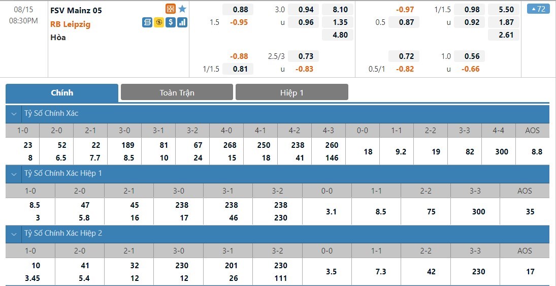 Dự đoán kèo tỷ số hiệp 1: Mainz 05 0-2 RB Leipzig