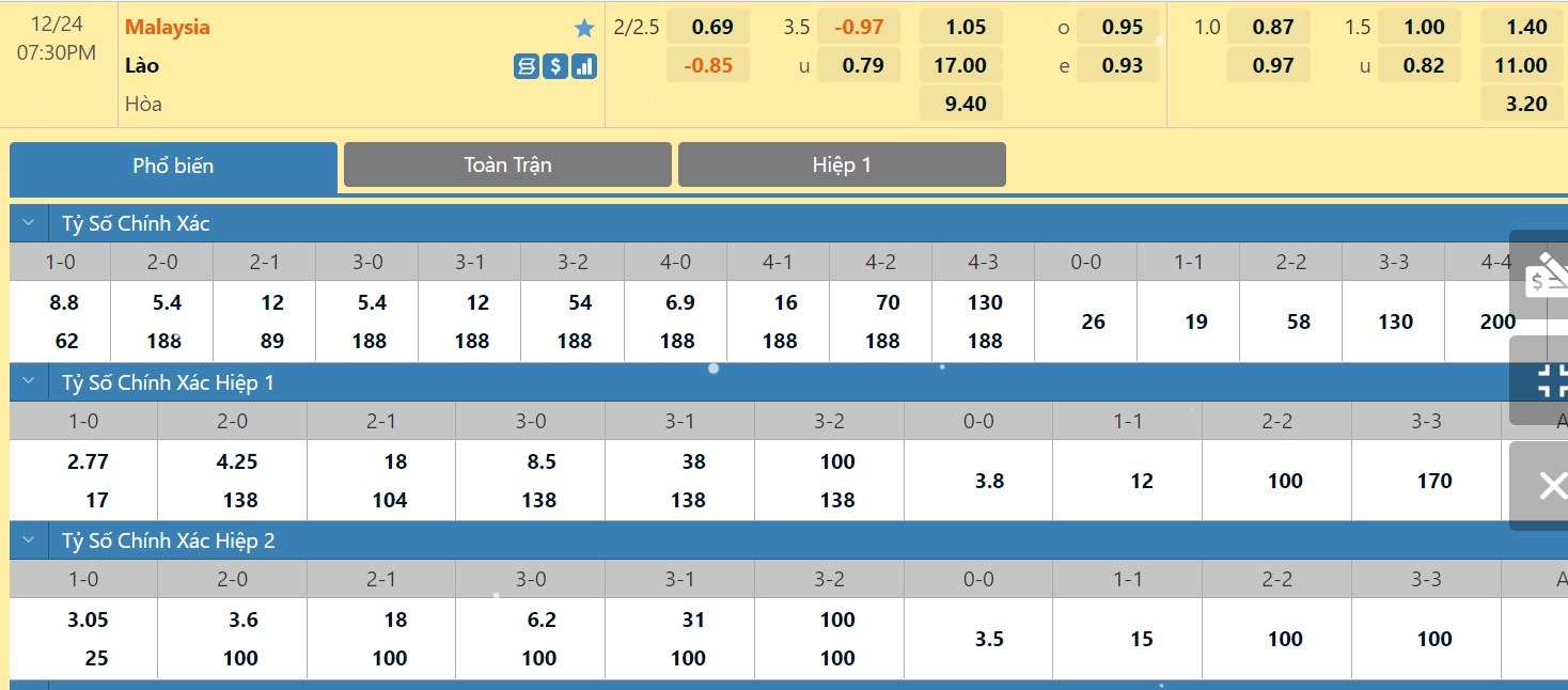 Soi kèo tài xỉu, kèo tỷ số Malaysia vs Lào