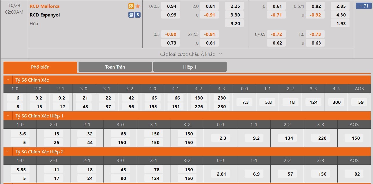 Espanyol và Mallorca đều là những đội bóng sở hữu những đội hình không mạnh và họ đang tấn công khá nghèo nàn. 5/6 trận gần nhất của Mallorca và 2/3 trận gần nhất của Espanyol đều kết thúc với chỉ tối đa 2 bàn thắng được ghi. Trận đấu này được dự đoán cũng sẽ có chất lượng chuyên môn không quá cao và bàn thắng sẽ không xuất hiện quá nhiều. Ô cược xỉu sẽ là lựa chọn cho kèo đấu này.