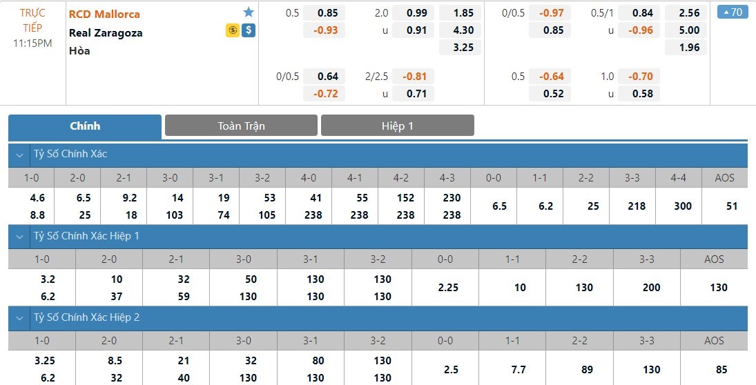 Soi kèo châu Á Mallorca vs Real Zaragoza