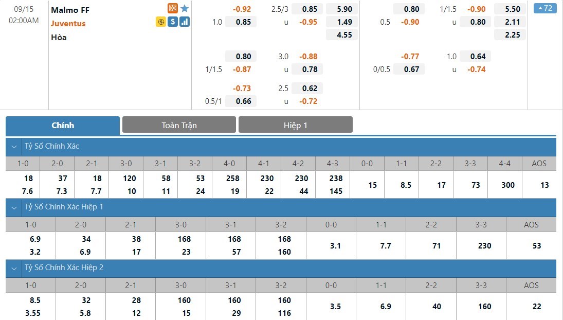 Juventus vẫn sẽ được đánh giá cao hơn Malmo rất nhiều ở kèo đấu này. Đội khách có tỷ lệ cược là 1 ăn 1.49 trong khi đó đội chủ nhà có tỷ lệ cược lên tới 1 ăn 5.90. Tỷ số hòa có tỷ lệ cược là 1 ăn 4.55. Malmo đang có phong độ khá tệ và đây sẽ là một đối thủ vừa sức cho Juventus. Với trình độ vẫn là vượt trội so với đối thủ, Juventus sẽ có chiến thắng ở trận đấu này.