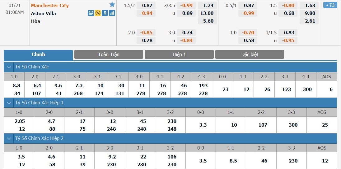 Man City được đánh giá cao hơn Aston Villa rất nhiều ở kèo đấu này. Tỷ lệ cược của đội chủ nhà chỉ là 1 ăn 1.24 trong khi đó đội khách có tỷ lệ cược lên tới 1 ăn 13.00. Tỷ số hòa có tỷ lệ cược là 1 ăn 5.60. Đây là lúc mà Man City đang có phong độ rất cao. Phải làm khách tại Etihad ở trận này, Aston Villa sẽ quá khó để tạo ra được bất ngờ và Man City được dự đoán sẽ có 3 điểm ở trận này.