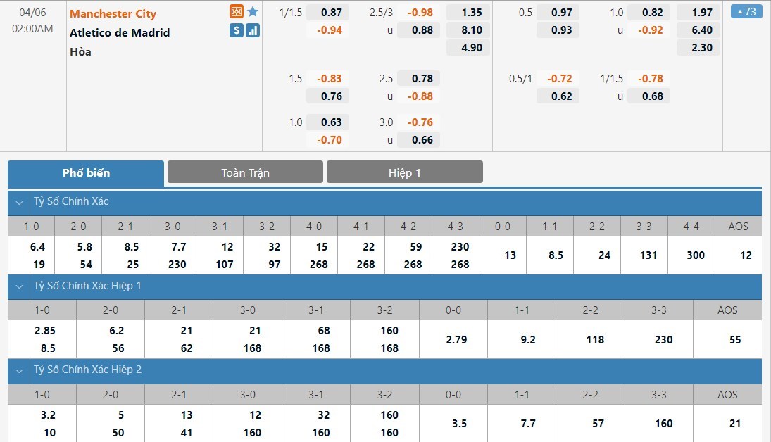 Man City được đánh giá cao hơn Atletico Madrid rất nhiều ở kèo đấu này. Tỷ lệ cược của Man City chỉ là 1 ăn 1.35 trong khi đó Atletico Madrid có tỷ lệ cược lên tới 1 ăn 8.10. Tỷ số hòa có tỷ lệ cược là 1 ăn 4.90. Man City lúc này đang tỏ ra nhỉnh hơn nhiều so với Atletico Madrid. Với lợi thế sân nhà, Man City sẽ kiếm được một thắng lợi ở trận này.