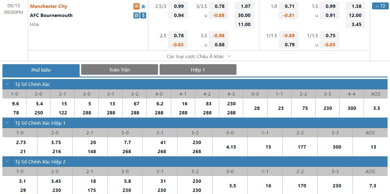 Man City sẽ được đánh giá cao hơn Bournemouth rất nhiều ở kèo đấu này. Kết quả Man City thắng trận chỉ có tỷ lệ cược là 1 ăn 1.07 trong khi đó kết quả Bournemouth thắng trận có tỷ lệ cược lên tới 1 ăn 30.00. Tỷ số hòa cũng có tỷ lệ cược rất cao với 1 ăn 11.00. Man City đang ở một đẳng cấp khác hẳn so với Bournemouth và chiến thắng sẽ khó thoát khỏi tay đoàn quân của HLV Pep Guardiola. Cửa trên Man City sẽ là lựa chọn cho kèo đấu này.