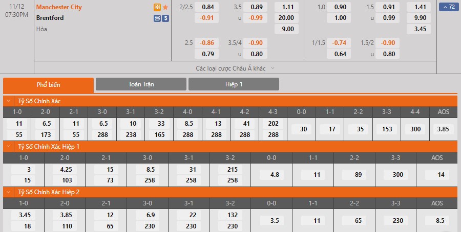Man City được đánh giá cao hơn Brentford rất nhiều ở trận này. Kết quả Man City thắng trận chỉ có tỷ lệ là 1 ăn 1.11 trong khi đó kết quả Brentford thắng trận có tỷ lệ cược lên tới 1 ăn 20.00. Tỷ số hòa có tỷ lệ cược cũng lên tới 1 ăn 9.00. Man City đang có phong độ rất cao và đây không phải lúc mà Brentford có thể tạo ra được bất ngờ trước nhà ĐKVĐ. Ở kèo đấu này, Man City được dự đoán vẫn sẽ có được 3 điểm trọn vẹn.