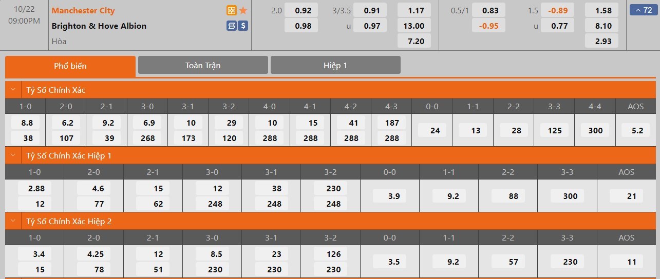 Brighton là đội có khả năng phòng ngự không tệ. Sau 9 vòng đấu của mùa giải năm nay, Brighton cũng mới thủng lưới 11 bàn. Trong khi đó Man City đang có chuỗi 2 trận liên tiếp không ghi bàn và họ đang có dấu hiệu sa sút. Với một tỷ lệ tài xỉu rất cao, ô cược xỉu sẽ là lựa chọn an toàn hơn cho kèo đấu này.