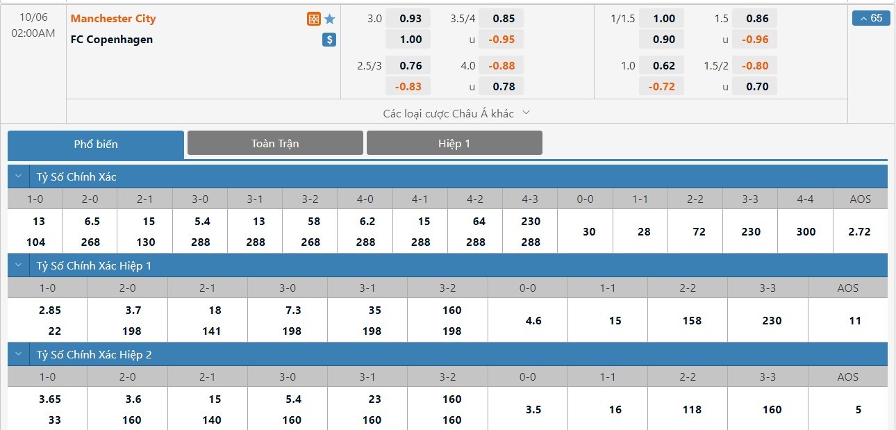 Tỷ lệ cược của Man City và Copenhagen ở kèo đấu này sẽ có sự chênh lệch cực kì lớn, Man City sẽ được đánh giá cao hơn Copenhagen rất nhiều ở trận này. Trình độ của 2 đội đang có sự chênh lệch quá nhiều. Man City đang tỏ ra vượt trội hoàn toàn so với một Copenhagen nhỏ bé. Phong độ của Man City cũng đang là cực kì cao và đội chủ nhà sẽ không gặp quá nhiều khó khăn để có được chiến thắng ở trận này.