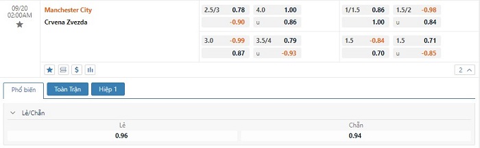 Soi kèo châu Á Manchester City vs Crvena Zvezda