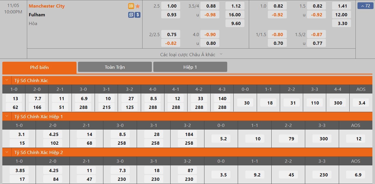 Tỷ lệ cược của Man City và Fulham ở kèo đấu này vẫn sẽ có sự chênh lệch rất lớn. Kết quả Man City thắng trận chỉ có tỷ lệ là 1 ăn 1.12 trong khi đó kết quả Fulham thắng trận có tỷ lệ lên tới 1 ăn 16.00. Tỷ số hòa có tỷ lệ là 1 ăn 9.60. Man City so với Fulham lúc này vẫn có trình độ vượt trội hơn quá nhiều. Đây là trận đấu mà Fulham còn phải làm khách và họ sẽ khó tránh được một thất bại. Cửa trên Man City vẫn sẽ là lựa chọn cho kèo đấu này.