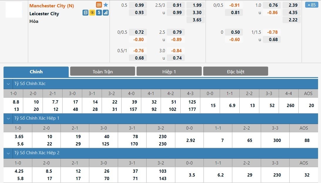 Man City vẫn sẽ được đánh giá cao hơn Leicester City khá nhiều ở kèo đấu này. Tỷ lệ cược của Man City chỉ là 1 ăn 1.99 trong khi đó Leicester có tỷ lệ cược lên tới 1 ăn 3.30. Tỷ số hòa có tỷ lệ cược là 1 ăn 3.65. Man City lúc này vẫn đang cho thấy sức mạnh trong khi đó Leicester đang không có phong độ cao. Ở kèo đấu này, cửa trên Man City sẽ là lựa chọn được đánh giá cao hơn.