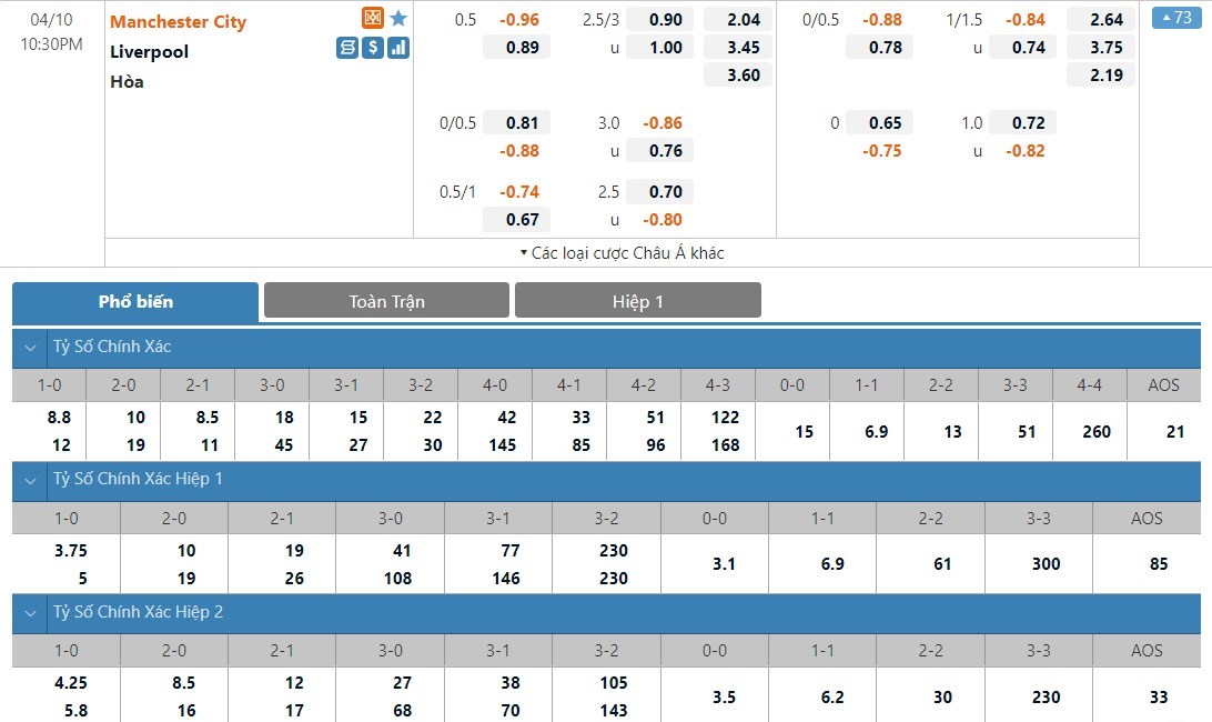 Soi kèo châu Á Manchester City vs Liverpool