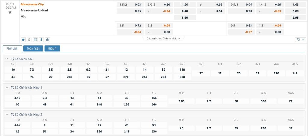 Soi kèo tài xỉu, kèo tỷ số Manchester City vs Manchester United
