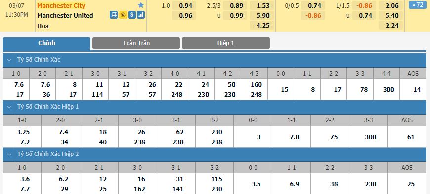 Dự đoán kèo tỷ số hiệp 1: Manchester City 1-0 Manchester United