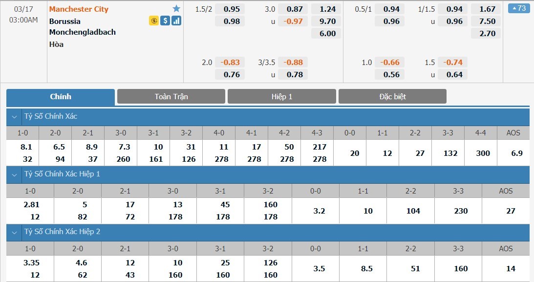Man City được đánh giá cao hơn Monchengladbach khá nhiều ở trận đấu này. Tỷ lệ cược của Man City chỉ là 1 ăn 1.24 trong khi đó Monchengladbach có tỷ lệ cược lên tới 1 ăn 9.70. Tỷ số hòa có tỷ lệ cược là 1 ăn 6.00. Man City đang tỏ ra cực kì ổn định. Trong khi đó Monchengladbach lại đang có phong độ tệ và sẽ là quá khó để đội bóng Đức có thể tạo ra được những bất ngờ ở trận này.