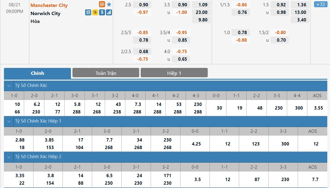 Man City vẫn sẽ được đánh giá cao hơn Norwich rất nhiều ở kèo đấu này. Tỷ lệ cược của Man City chỉ là 1 ăn 1.09 trong khi đó Norwich có tỷ lệ cược lên tới 1 ăn 23.00. Tỷ số hòa có tỷ lệ cược là 1 ăn 9.80. Làm khách trước Man City lúc này vẫn là một nhiệm vụ quá khó khăn cho Norwich và họ vẫn sẽ rất khó để tránh được một thất bại.