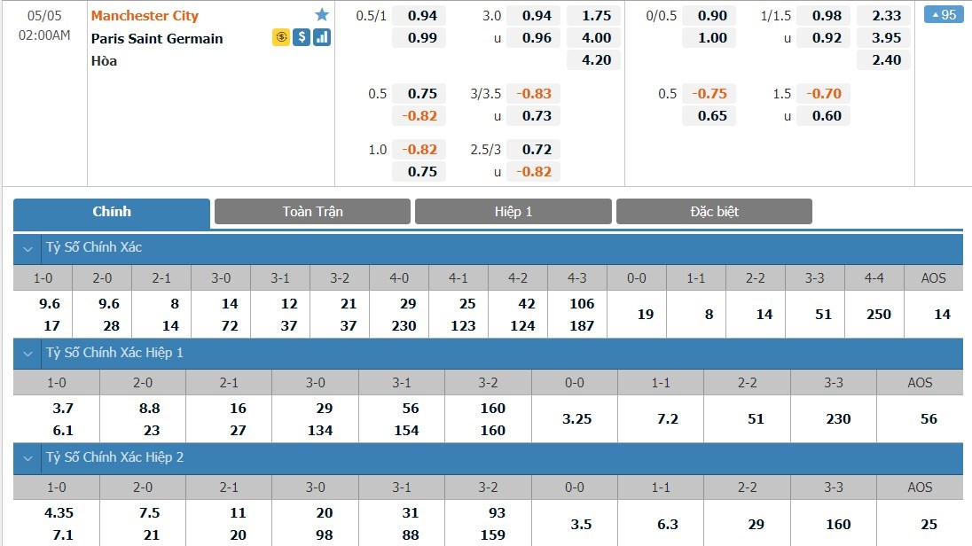 Man City được đánh giá là cửa trên ở trận này với tỷ lệ cược 1 ăn 1.75. PSG có tỷ lệ cược lên tới 1 ăn 4.00 trong khi đó tỷ số hòa có tỷ lệ cược là 1 ăn 4.20. Man City đang nắm lợi thế và họ sẽ không cần thiết phải thi đấu quá mạo hiểm ở trận này. Với việc đội chủ nhà thi đấu cẩn trọng, khả năng trận đấu này kết thúc với tỷ số hòa là khá cao.