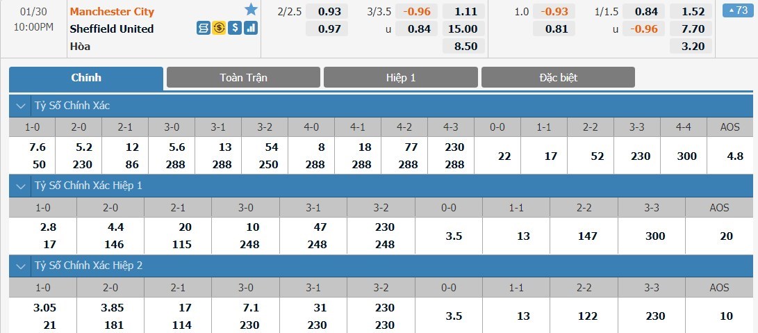 Tỷ lệ cược của Man City và Sheffield United ở kèo đấu này có sự chênh lệch lớn. Man City chỉ có tỷ lệ cược là 1 ăn 1.11 trong khi đó Sheffield United có tỷ lệ cược lên tới 1 ăn 15.00. Tỷ số hòa cũng có tỷ lệ cược rất cao với 1 ăn 8.50. Sheffield United đang tỏ ra quá yếu đuối và họ đang thua kém Man City rất nhiều. Sẽ là không có cơ hội để Sheffield United có thể tạo ra được bất ngờ và đây là kèo đấu mà người chơi nên lựa chọn an toàn.