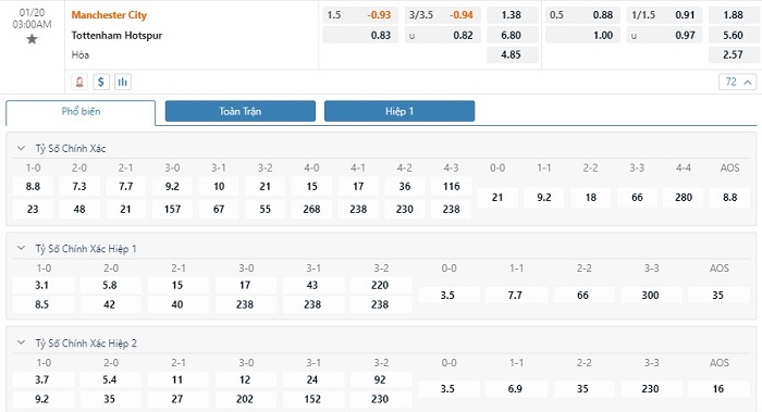Không có gì ngạc nhiên khi nhà cái vẫn đánh giá rất cao khả năng chiến thắng của Manchester City. Nhà cái đặt đội chủ nhà ở thế cửa trên với mốc chấp sâu lên tới -1 1/2 trái. Song cũng đừng quên rằng chính Tottenham đã đánh bại Manchester City trong 2 lần gần nhất hai đội đối đầu. Vậy nên, để an toàn thì người chơi nên lựa chọn cửa dưới kèo đấu này.