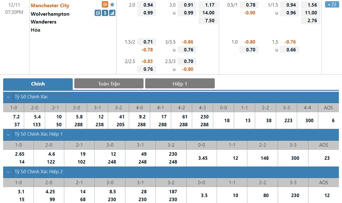 Soi kèo châu Á Manchester City vs Wolverhampton