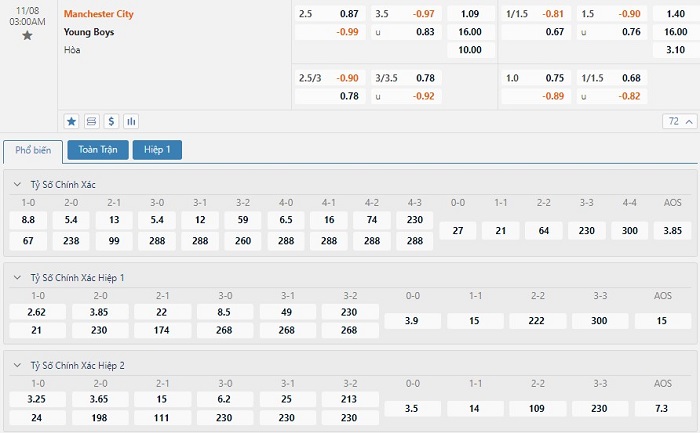 Trong 5 trận đấu gần nhất trên mọi đấu trường, Man City đã mang về cho mình 14 pha lập công cùng với 3 lần phải vào lưới nhặt bóng. Bên kia chiến tuyến, Young Boys đã sở hữu 8 bàn thắng, còn lại là việc hàng thủ đã phải nhận 5 bàn thua. Các nhà đầu tư nên tin tưởng vào khả năng nổ Tài ở cuộc đối đầu này với tỷ lệ tài xỉu là 3 1/2 trái.