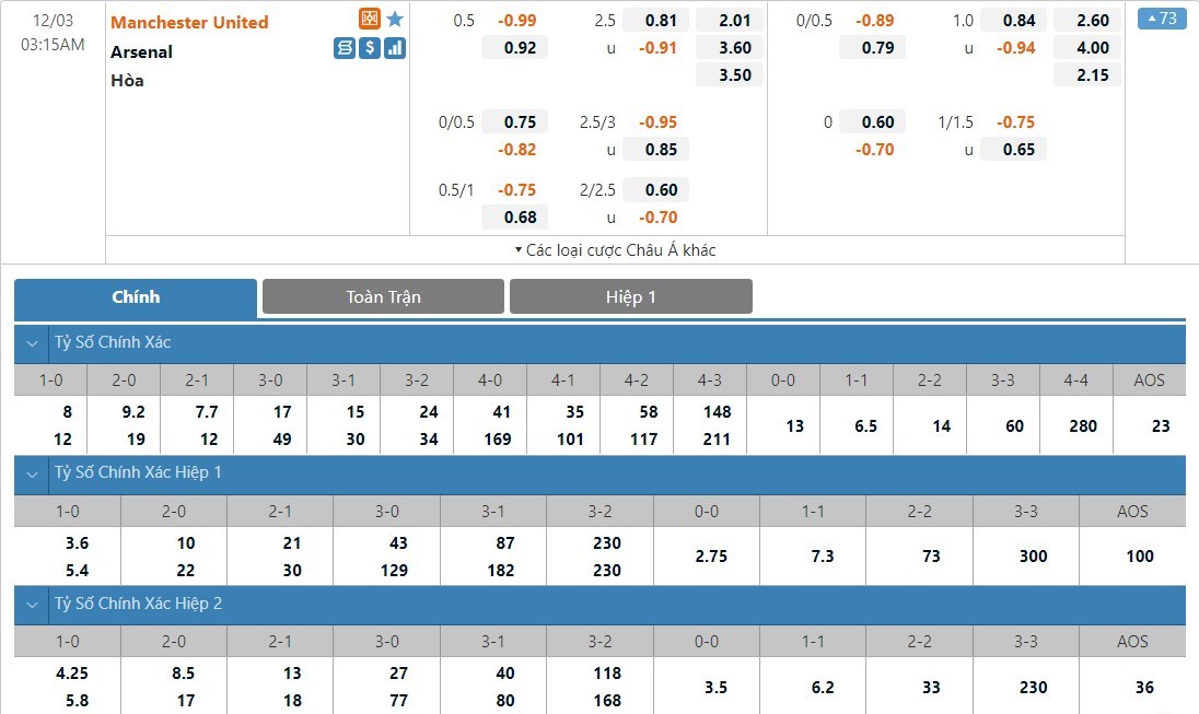 Soi kèo châu Á Manchester United vs Arsenal