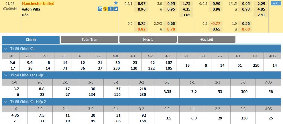 Dự đoán kèo tỷ số hiệp 1: Manchester United 1-1 Aston Villa