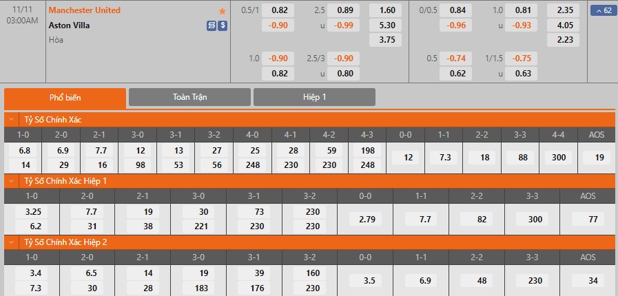 Soi kèo châu Á Manchester United vs Aston Villa