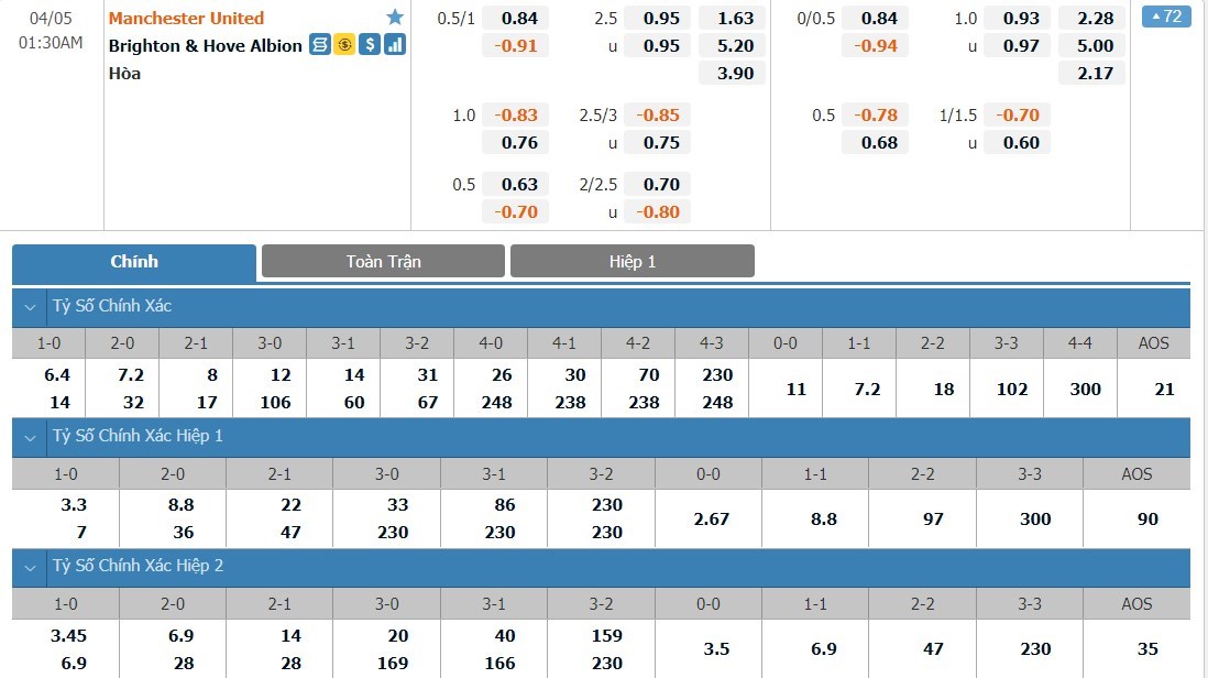 Man United vẫn được đánh giá cao hơn Brighton khá nhiều ở kèo này. Tỷ lệ cược của Man United là 1 ăn 1.63 trong khi đó Brighton có tỷ lệ cược là 1 ăn 5.20. Tỷ số hòa có tỷ lệ cược là 1 ăn 3.90. Brighton không phải cái tên được đánh giá quá cao. Trước một đối thủ vừa sức và được thi đấu trên sân nhà, Man United sẽ đủ khả năng giành trọn 3 điểm ở trận này.