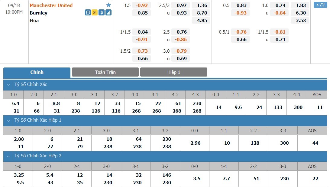 Tỷ lệ cược của Man United và Burnley ở kèo đấu này có sự chênh lệch lớn. Man United chỉ có tỷ lệ cược là 1 ăn 1.36 trong khi đó Burnley có tỷ lệ cược lên tới 1 ăn 8.70. Tỷ số hòa có tỷ lệ cược là 1 ăn 4.85. Man United đang có phong độ cao trong khi đó Burnley thi đấu khá tệ ở những trận gần đây. Với đẳng cấp vượt trội, Man United được dự đoán sẽ có 3 điểm ở trận này.