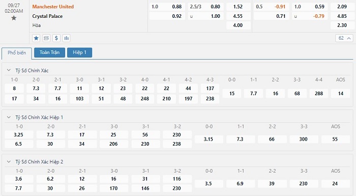 Soi kèo châu Á Manchester United vs Crystal Palace
