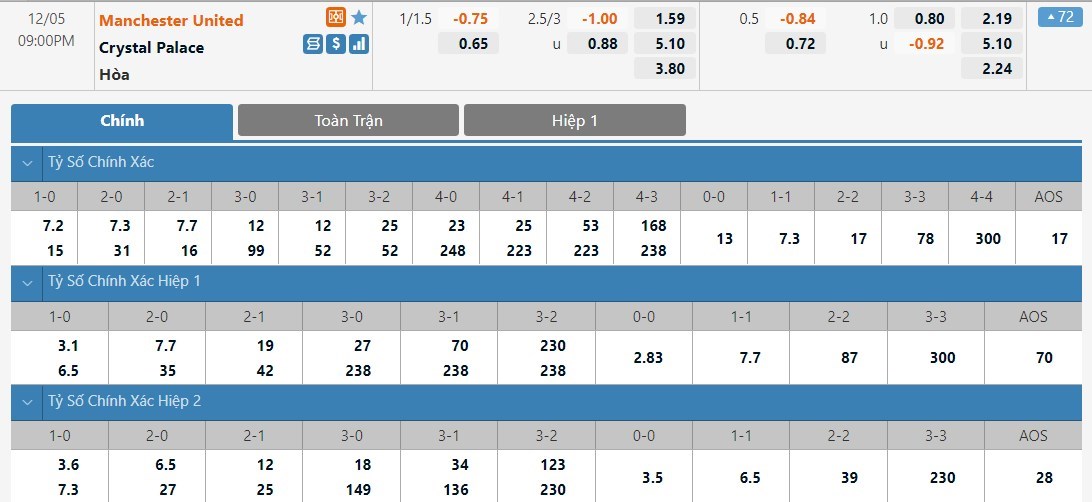 Dự đoán kèo tỷ số hiệp 1: Manchester United 2-0 Crystal Palace
