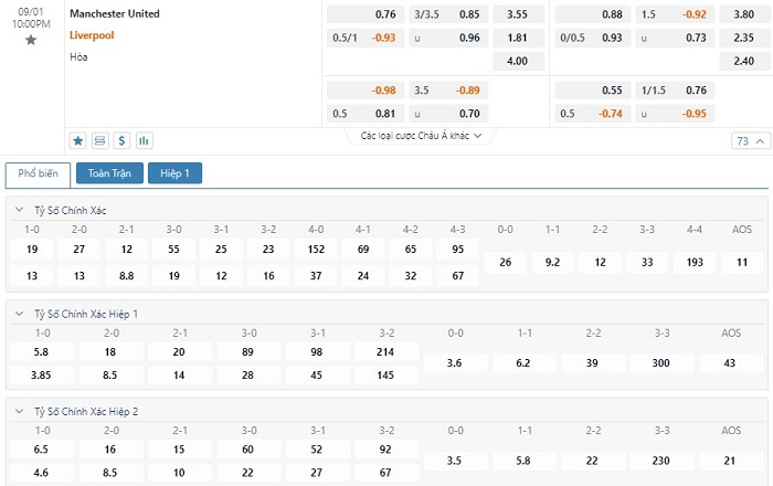 Dự đoán kèo tỷ số hiệp 1: Manchester United 0-1 Liverpool