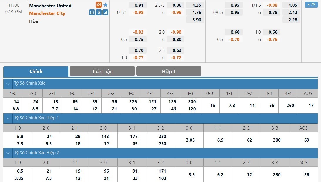 Man City được đánh giá cao hơn Man United khá nhiều ở kèo đấu này dù họ là đội phải làm khách. Tỷ lệ cược của Man City chỉ là 1 ăn 1.75 trong khi đó Man United có tỷ lệ cược lên tới 1 ăn 4.35. Tỷ số hòa có tỷ lệ cược là 1 ăn 3.90. Man United vẫn đang tỏ ra quá bất ổn. Trước một Man City rất đẳng cấp, Man United nhiều khả năng sẽ thất bại ở trận này.