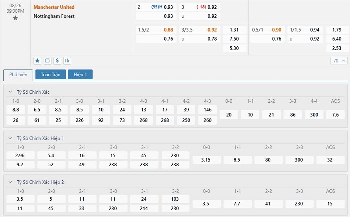 Tuy vừa thắng đội bóng tân binh mới thăng hạng Sheffield United với tỷ số 2-1, song Nottingham Forest không vì thế mà có thể tự tin trong lần viếng thăm sân nhà của Manchester United sắp tới. Thực tế thì chiến thắng vừa qua mới là thắng lợi đầu tiên của Nottingham trong 6 lần ra sân gần nhất. Trước đó, Nottingham Forest đã trải qua 5 trận liền không biết đến mùi chiến thắng. Ở 5 trận này, họ chỉ ghi 1 bàn, để thủng lưới 10 lần và phải nhận tới 4 thất bại. Tỷ lệ kèo ở cuộc đối đầu này là -1 1/2 trái nghiêng về Manchester United và tỷ lệ này là hoàn toàn không có gì bất ngờ vào lúc này. Các nhà đầu tư nên tin tưởng vào đội chủ nhà ở trận này để mang về cơ hội thắng kèo cao hơn.