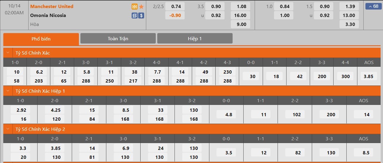 Tỷ lệ cược của Man United và Omonia Nicosia ở kèo đấu này có sự chênh lệch rất đáng kể. Kết quả Man United thắng trận chỉ có tỷ lệ là 1 ăn 1.08 trong khi đó kết quả Omonia Nicosia thắng trận có tỷ lệ cược lên tới 1 ăn 16.00. Tỷ số hòa có tỷ lệ cược là 1 ăn 9.00. Man United đang có phong độ không tệ và trước một đối thủ thua kém nhiều về trình độ họ vẫn sẽ có được một chiến thắng. Cửa trên Man United sẽ là lựa chọn cho kèo đấu này.