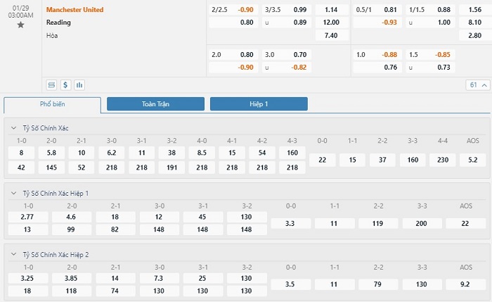 Dự đoán kèo tỷ số hiệp 1: Manchester United 2-0 Reading