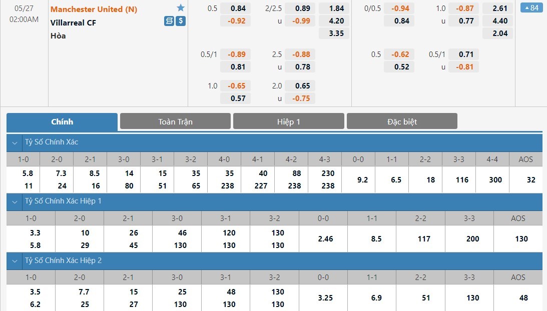 Man United vẫn được đánh giá cao hơn Villarreal rất nhiều ở kèo đấu này. Tỷ lệ cược của Man United chỉ là 1 ăn 1.84 trong khi đó Villarreal có tỷ lệ cược là 1 ăn 4.20. Tỷ số hòa có tỷ lệ cược là 1 ăn 3.35. Man United mùa này thi đấu rất ấn tượng ở sân chơi Europa League. Tung ra sân đội hình mạnh nhất, Man United sẽ đủ khả năng để lấn lướt Villarreal và đội bóng Anh sẽ có chiến thắng ở trận này.