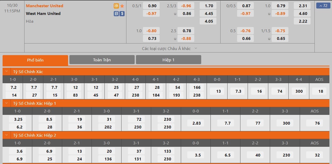 Dự đoán kèo tỷ số hiệp 1: Manchester United 2-0 West Ham United