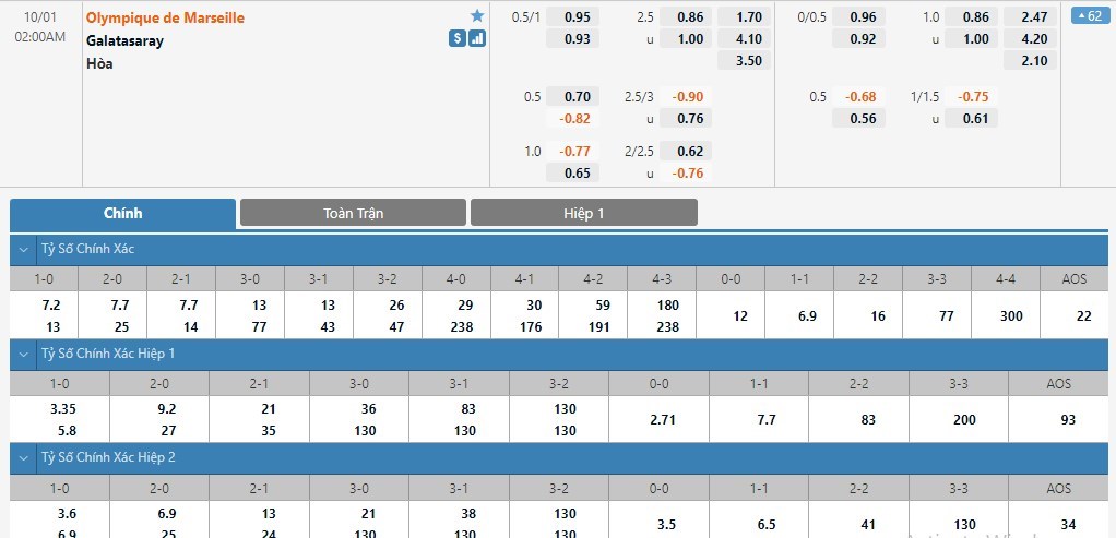 Marseille sẽ là cửa trên ở trận này với tỷ lệ cược 1 ăn 1.70. Galatasaray có tỷ lệ cược lên tới 1 ăn 4.10 trong khi đó tỷ số hòa có tỷ lệ cược là 1 ăn 3.50. Phong độ của Marseille đang là không tốt. Không tỏ ra quá vượt trội so với Galatasaray, Marseille nhiều khả năng sẽ bị cầm hòa ở trận này.