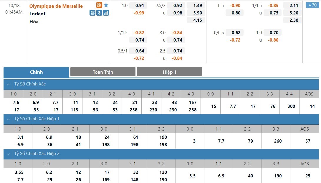 Marseille sẽ được đánh giá cao hơn Lorient khá nhiều ở kèo này. Đội chủ nhà chỉ có tỷ lệ cược là 1 ăn 1.49 trong khi đó đội khách có tỷ lệ cược lên tới 1 ăn 5.90. Tỷ số hòa có tỷ lệ cược là 1 ăn 4.15. Marseille đang có phong độ không tốt. Trước một Lorient thi đấu rất tiến bộ ở mùa giải này, đội chủ nhà nhiều khả năng sẽ phải chấp nhận chia điểm.