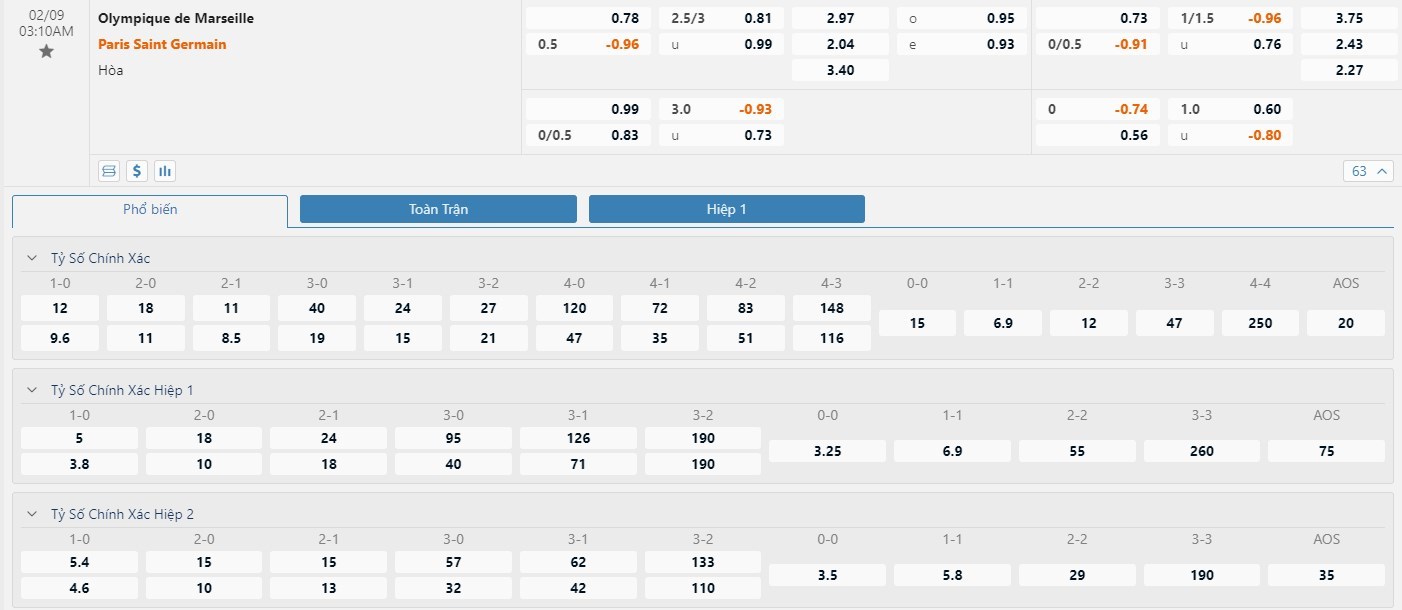Dự đoán kèo tỷ số hiệp 1: Marseille 0-1 Paris Saint-Germain