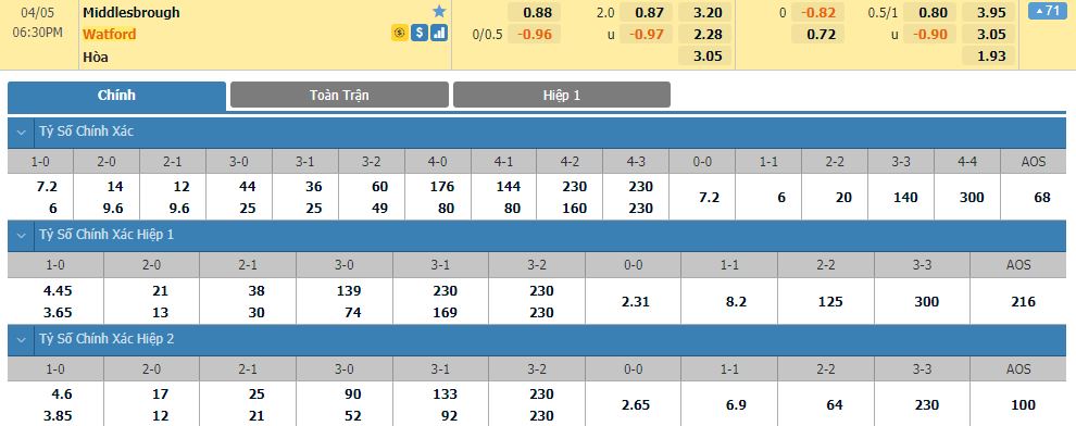 Như đã đề cập, đội chủ nhà đang bứt phá vô cùng mạnh mẽ trong thời gian vừa qua. Middlesbrough đã giành được tới 3 chiến thắng và chỉ để thua 2 trận trong 5 vòng đấu gần nhất trên khuôn khổ giải Hạng Nhất. Nhưng thật đáng tiếc cho họ, đối thủ Watford vẫn đang duy trì được phong độ cần có của 1 ông lớn trong nhóm dẫn đầu với trận bất bại thứ 5 liên tiếp. Họ thậm chí đã giành chiến thắng trong cả 5 trận kể trên. Chính vì lẽ đó, dù phải làm khách trên sân đối thủ, Watford vẫn sẽ được đánh giá cao hơn và sẽ phải chấp bàn trong hiệp thi đấu thứ 2 trên kèo Châu Á.
