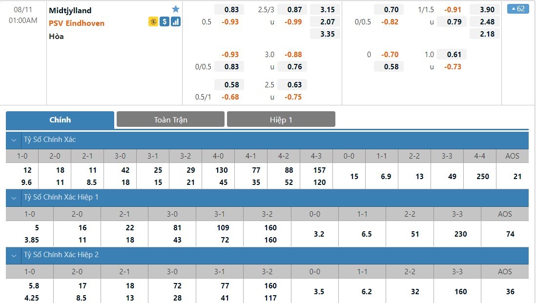 Kèo châu Âu hiệp 1: PSV Eindhoven