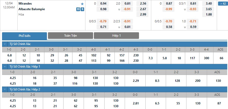 Tỷ lệ cược của Mirandes và Albacete ở trận đấu này gần như cân bằng. Kết quả Mirandes thắng trận có tỷ lệ cược là 1 ăn 2.56 trong khi đó kết quả Albacete thắng trận có tỷ lệ cược lên tới 1 ăn 2.67. Tỷ số hòa có tỷ lệ cược cao nhất ở kèo đấu này với 1 ăn 2.99. Trình độ của 2 đội này đang là không quá chênh lệch. Được chơi trên sân nhà nhưng Mirandes cũng sẽ không dễ vượt qua một Albacete khá khó chịu và ô cược hòa sẽ là lựa chọn cho kèo đấu này.