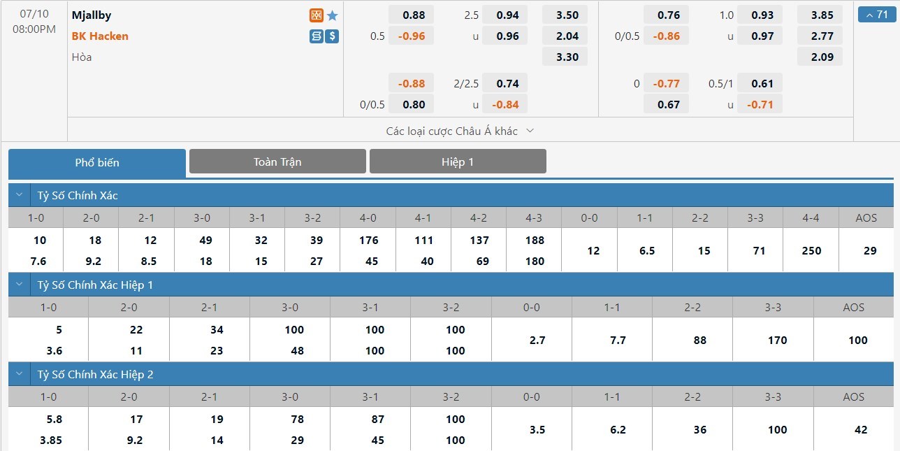 Phải làm khách nhưng Hacken vẫn sẽ được đánh giá cao hơn so với Mjallby ở trận này. Kết quả đội khách thắng trận có tỷ lệ cược chỉ là 1 ăn 2.04 trong khi đó kết quả đội chủ nhà thắng trận có tỷ lệ cược lên tới 1 ăn 3.50. Tỷ số hòa có tỷ lệ cược là 1 ăn 3.30. Mjallby không phải cái tên dễ chơi và họ đang có chuỗi 3 trận bất bại. Ở cả 3 lần gần nhất 2 đội gặp nhau, trận đấu cũng đều kết thúc với tỷ số hòa và ô cược hòa sẽ là lựa chọn cho kèo đấu này.
